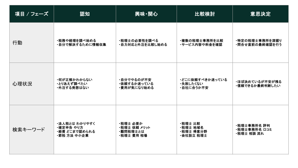 そのため、カスタマージャーニーマップを作成した上で、各フェーズで検索しそうなキーワードを洗い出していきます。