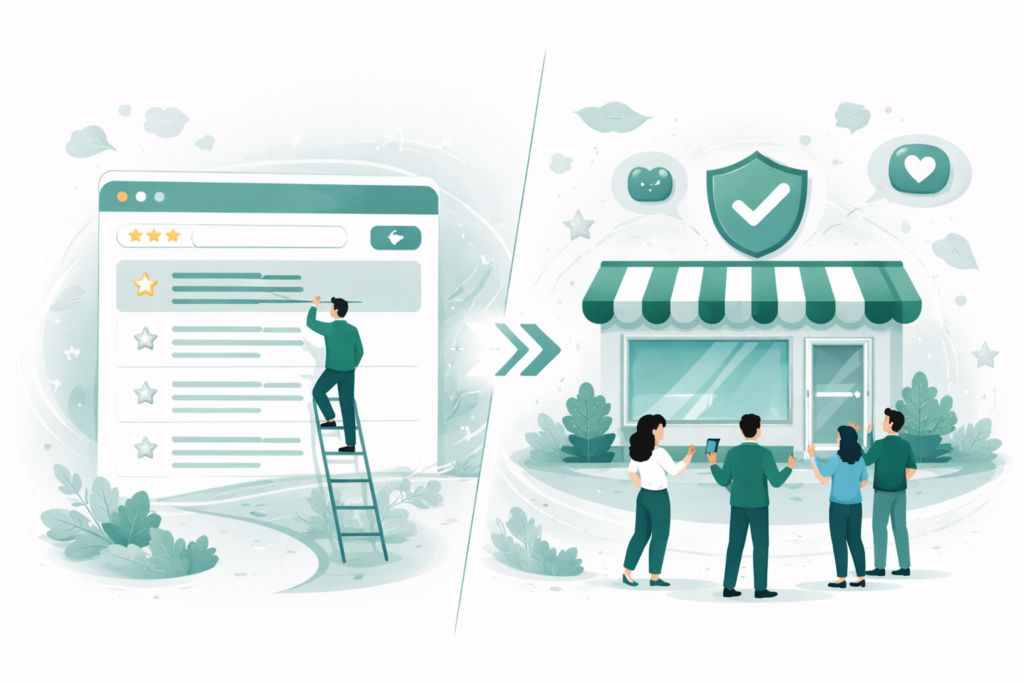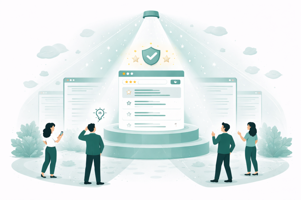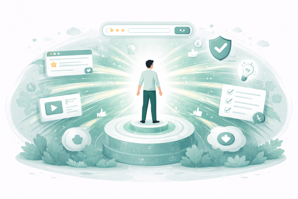 検索順位の高さをそのまま信頼性の高さと結びつけない、ITリテラシーの高いユーザーもいますが、多くのユーザーにとって上位表示は無意識下で信頼につながります。