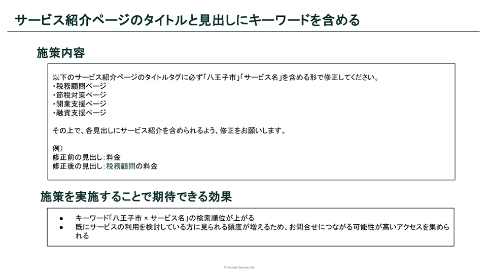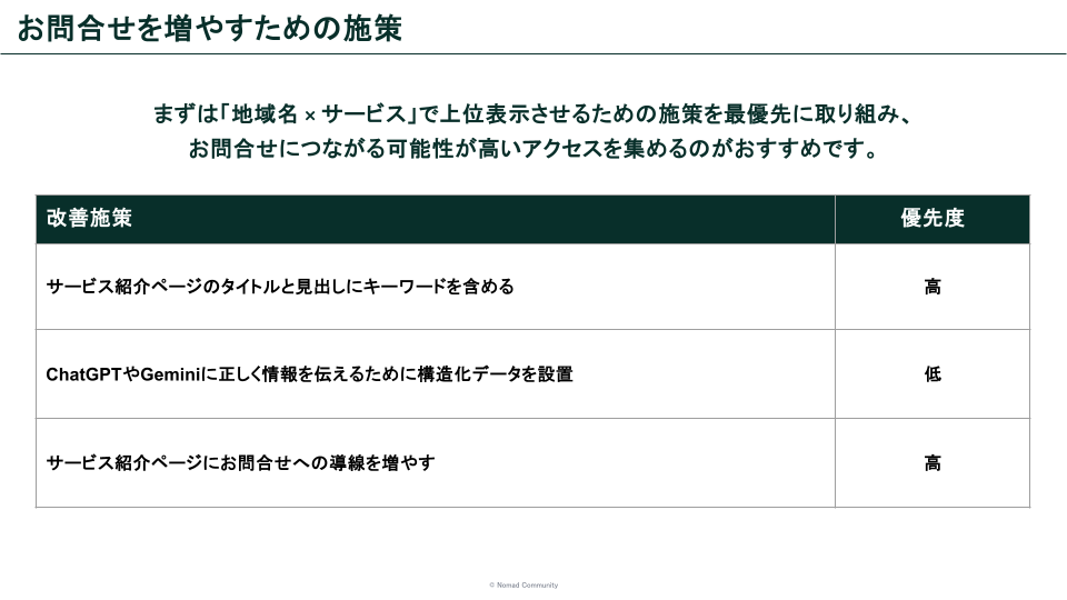 - サービス紹介ページにお問合せページへの誘導がない